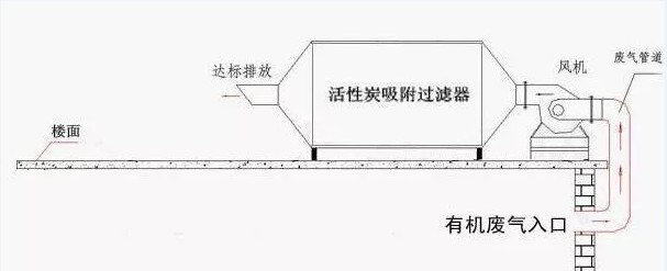 有機廢氣先通過干式過濾,將廢氣中顆粒狀污染物截留去除,然后進入活性炭吸附床進行吸附,利用具有大比表面積的蜂窩狀活性炭將有機溶劑吸附在活性炭表面,處理后干凈的氣流經(jīng)過風機、煙囪高空排放。