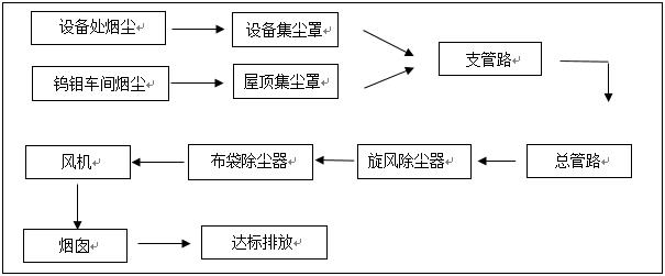 鎢鉬生產(chǎn)車間現(xiàn)有燒結(jié)設(shè)備、壓料設(shè)備、軋制設(shè)備共計(jì)5臺(tái)設(shè)備,正常作業(yè)為先從燒結(jié)設(shè)備取出板料,在通過壓料或者軋制設(shè)備加工。在取出板料的瞬間及運(yùn)送到壓料或者軋制設(shè)備期間有大量的煙塵產(chǎn)生;板料在壓料或者軋制加工過程中也會(huì)有煙塵產(chǎn)生。