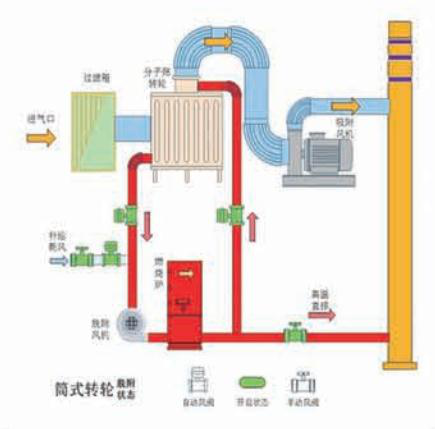轉(zhuǎn)輪吸附+催化燃燒就VOCs治理經(jīng)典工藝,適用于絕大多數(shù)行業(yè)。廢氣經(jīng)過預(yù)處理后,進(jìn)入轉(zhuǎn)輪進(jìn)行吸附凈化,達(dá)標(biāo)排放。當(dāng)沸石轉(zhuǎn)輪滿足脫附條件時(shí),系統(tǒng)進(jìn)行介質(zhì)再生。與CTO相配合,完成脫附和燃燒氧化,分解VOCs分子,成生二氧化碳和水。