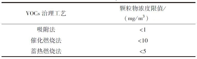 關(guān)于VOCs處理系統(tǒng)中顆粒物的濃度要求,目前國(guó)家已有相關(guān)技術(shù)規(guī)范,明確規(guī)定采用吸附法、催化燃燒法、蓄熱焚燒法時(shí),有機(jī)廢氣中的顆粒物濃度限值如下所示。